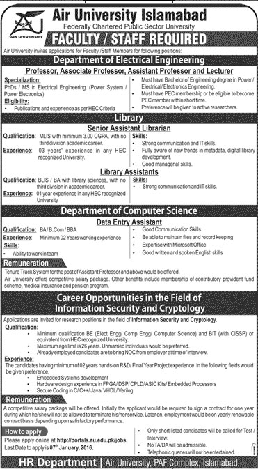 Career opportunities for different Admin & Faculty jobs in Islamabad. These Engineering Faculty & Admin Jobs in Air University Islamabad are various posts. candidates are required to apply online on these faculty jobs by visiting Air university website http://portals.au.edu.pk/.