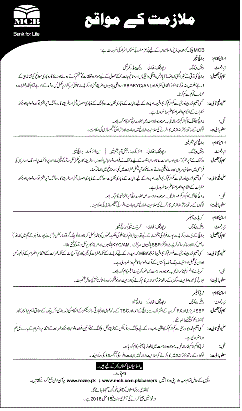 Career opportunity in banking For various posts. These Bank Jobs vacancies are announced as Branch Banking Jobs in MCB Bank Pakistan. Candidates can apply on these MCB Bank Jobs by sending their CVs at the website addresses given below.